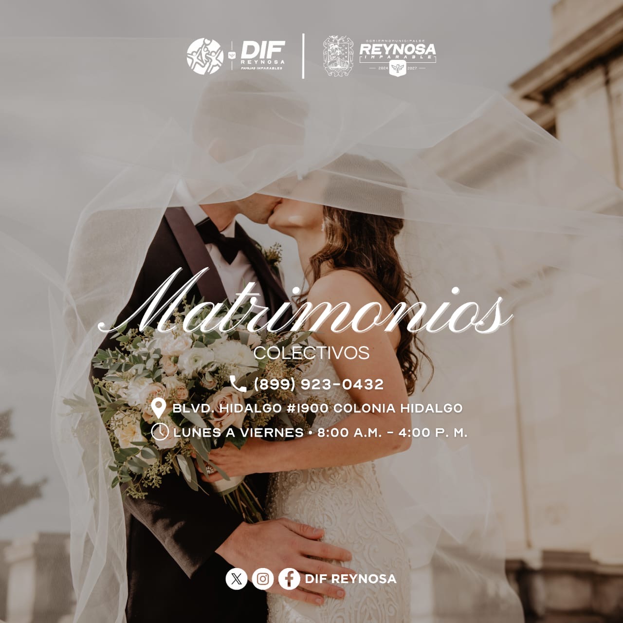 Para dar certeza legal a las familias, el Sistema DIF-Reynosa, que preside Carlos Luis Peña Garza, en coordinación con el Gobierno Municipal que encabeza el Alcalde, Carlos Peña Ortiz, invita a las parejas reynosenses a participar en la Campaña de Matrimonios Colectivos 2025, una oportunidad para unir sus vidas de manera legal y gratuita.