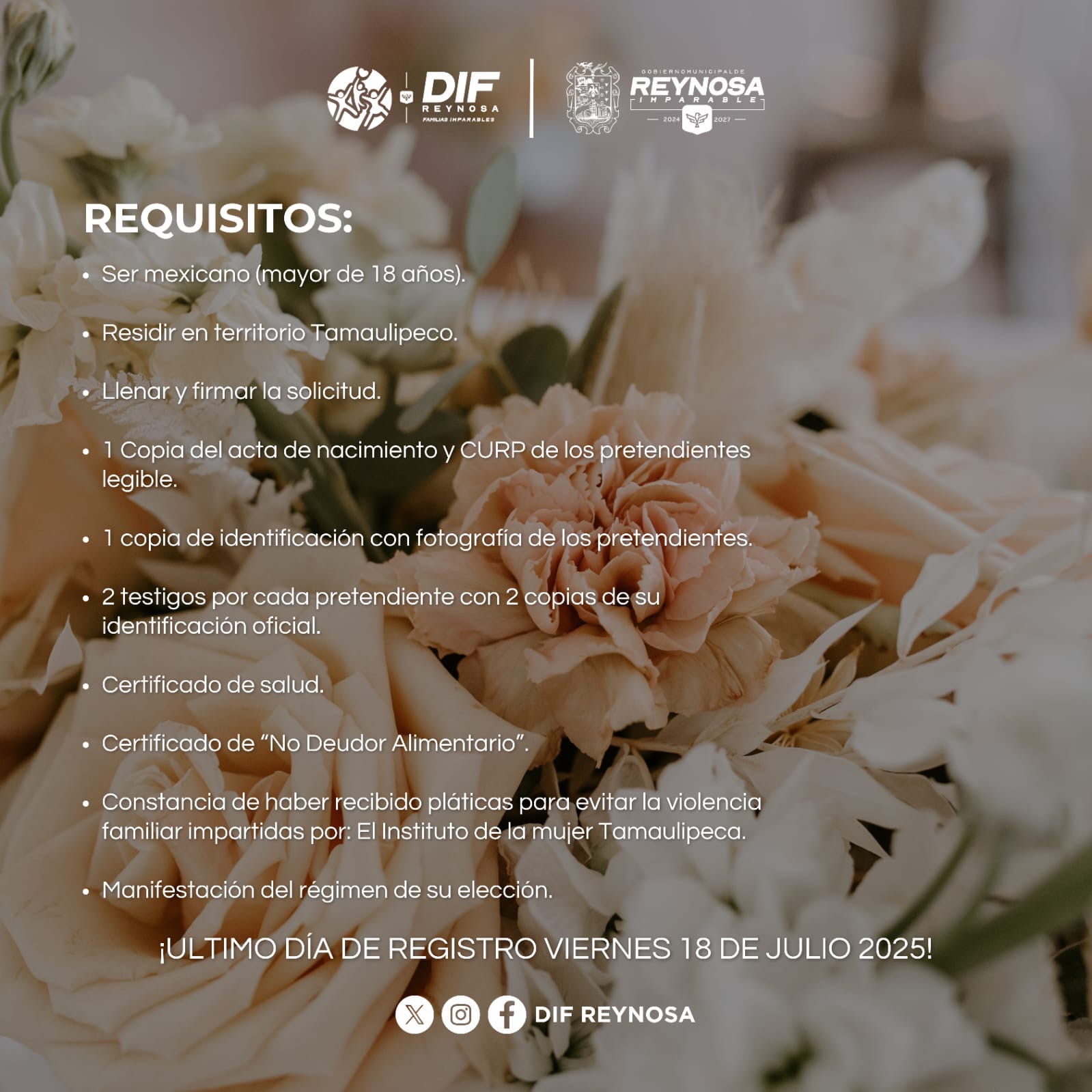 Se invita a las parejas interesadas para que acudan a realizar su trámite y sean parte de este evento que celebra el amor, la unión familiar y el fortalecimiento del tejido social de nuestra ciudad.
