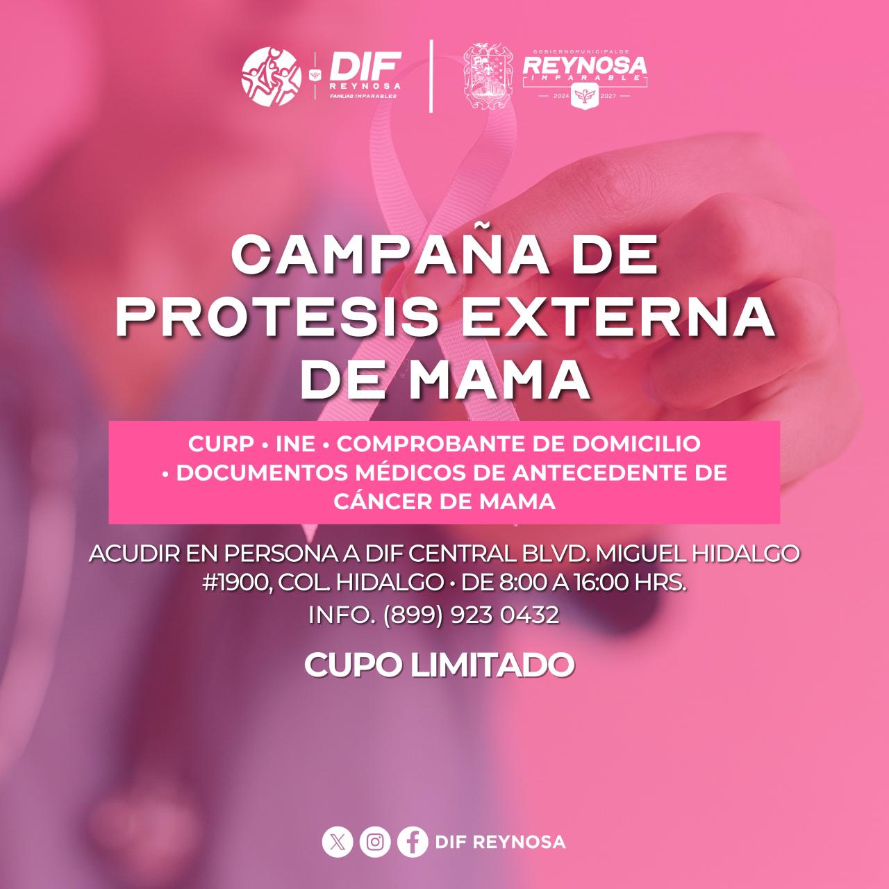 El Sistema DIF-Reynosa que preside Carlos Luis Peña Garza, dio inicio al registro para la Campaña de Prótesis Externa de Mama, dirigida a mujeres sobrevivientes de cáncer que requieran este apoyo para mejorar su calidad de vida y recuperar confianza en su proceso de rehabilitación.