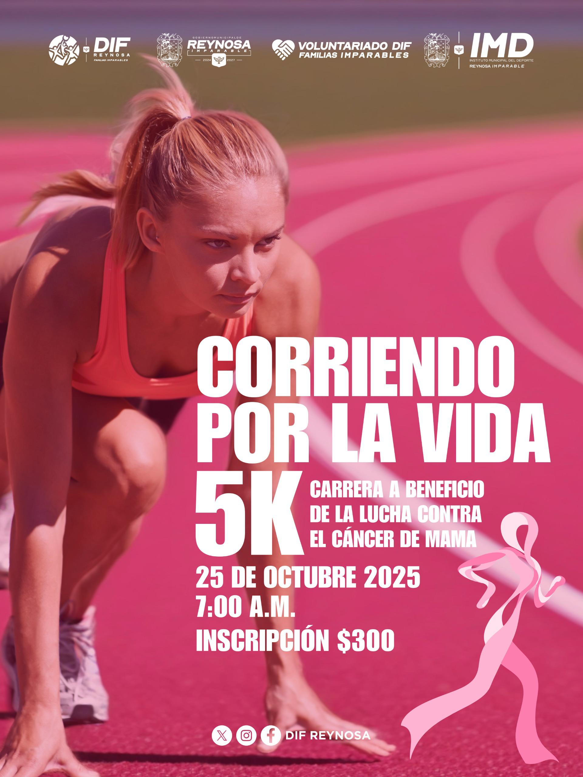 El Sistema DIF Reynosa, en conjunto con el Voluntariado DIF, el Gobierno Municipal y el Instituto Municipal del Deporte, invita a la ciudadanía a sumarse a la carrera 5K “Corriendo por la Vida”, que se llevará a cabo el próximo 25 de octubre a las 7:00 de la mañana en las instalaciones del Museo del Ferrocarril, ubicado en Ferrocarril s/n, en la zona centro, Reynosa.