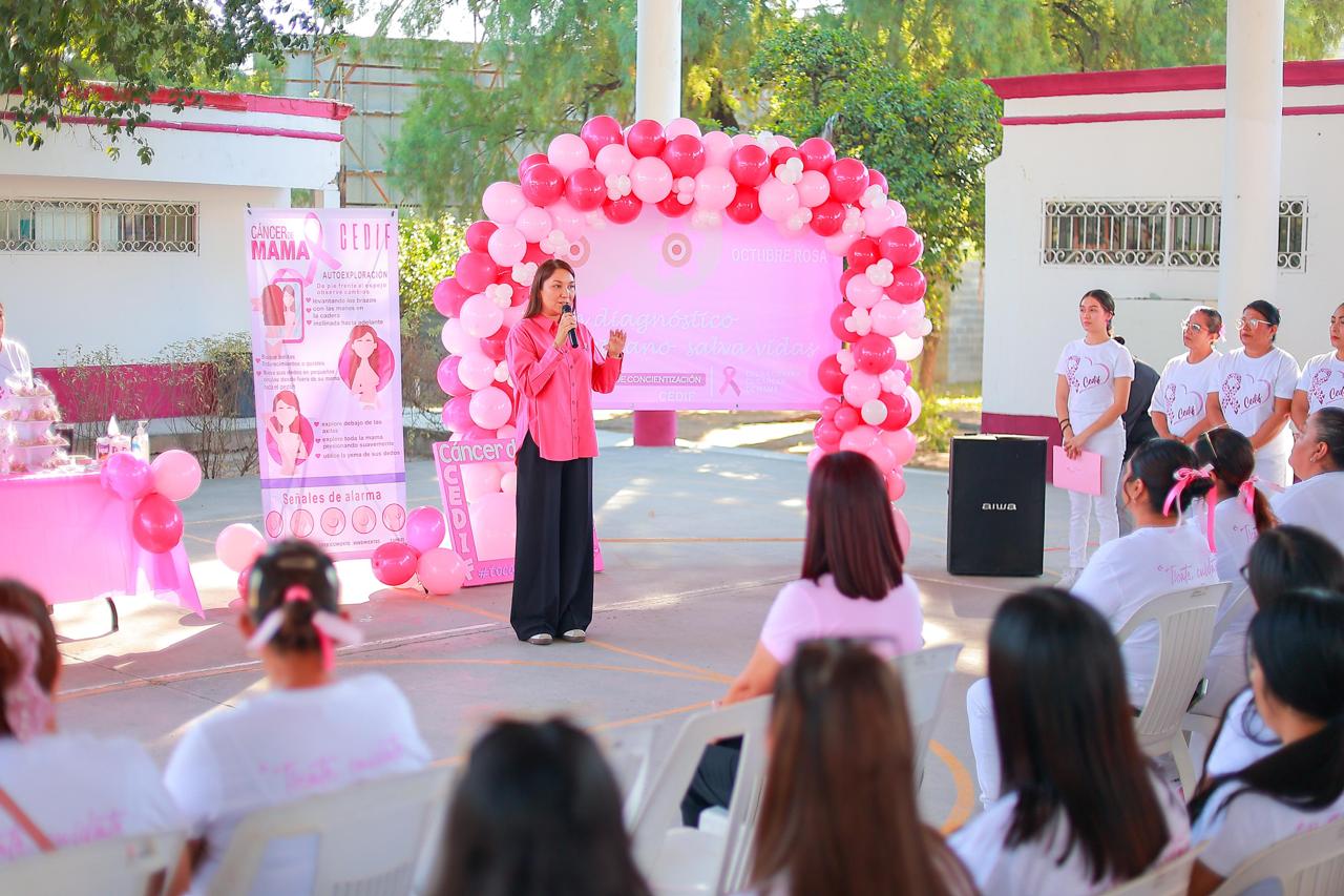 “Lo más importante es que te tienes que tocar, conocerte y si ves algo que no te gusta te puedes acercar a la Coordinación de Salud Integral de la Mujer que tenemos en el DIF para que te hagan tu estudio, hacemos mamografías todo el año”, dijo en su mensaje la Directora del DIF Municipal. Asistieron al evento la coordinadora de CEDIF, Cynthia Martínez Hernández y alumnos del taller de enfermería.
