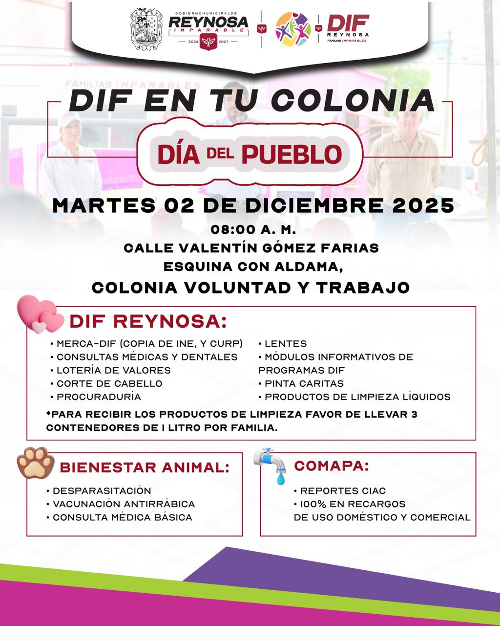 Este martes 18 de noviembre en Fraccionamiento Villa Florida. El Gobierno Municipal de Reynosa, que encabeza el Alcalde, Carlos Peña Ortiz, a través del Sistema DIF que preside Carlos Luis Peña Garza, llevará a cabo la Brigada “DIF en Tu Colonia”, acercando servicios y apoyos gratuitos […]